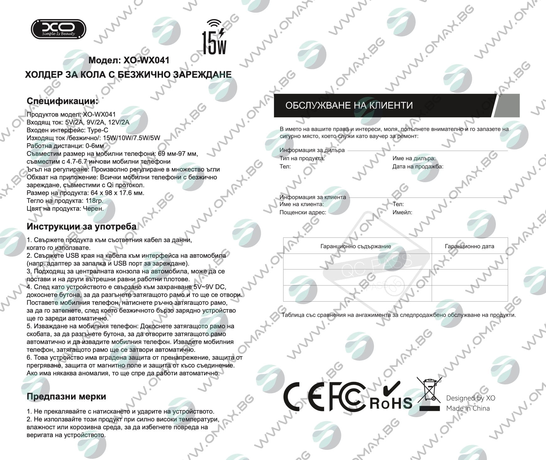 Декларация от производител XO Холдер 15W Wireless за прикрепяне /черен/ - WX041: Свали
