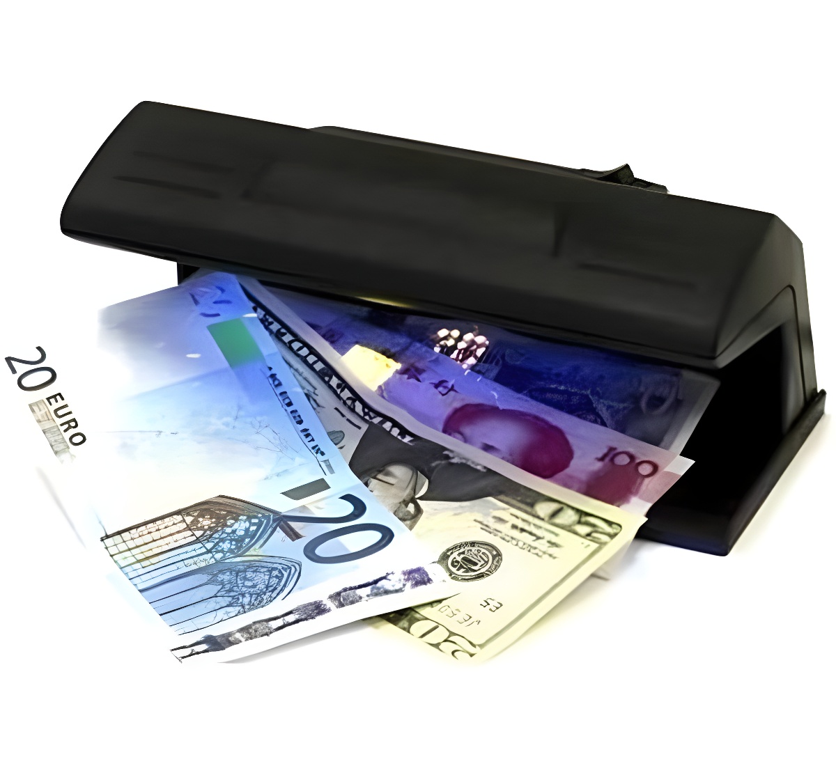 * Уредът ясно различава истински от фалшиви банкноти — при оригинална банкнота се виждат само специфични защитни елементи, докато при фалшива свети цялата повърхност.