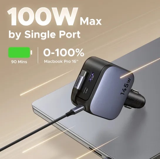 UGREEN 12V 145W, USB-A + 2xUSB-C + кабел C-C /графит/ - EC604 / 55910B