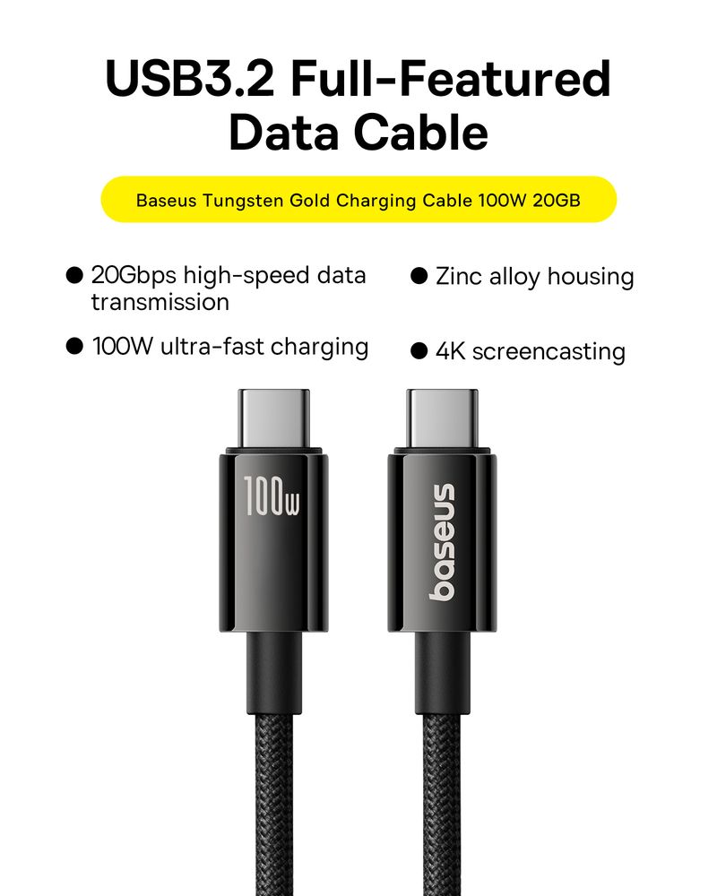 BASEUS Кабел Type-C - Type-C, 1.5м, 100W, Tungsten Gold /черен/ - P10319800111-00