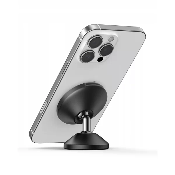 * Компактна автомобилна стойка с магнитно закрепване и вертикален (low-profile) дизайн, предназначена за монтаж върху таблото или друга равна повърхност.